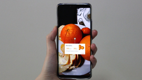 Kameraya gösterdiğiniz yiyeceklerin ismi ve 100 gramında ne kadar kalori bulunduğu bilgisi ekrana geliyor. AR yani Artırılmış Gerçeklik (Agumented Reality) özelliği ile yiyeceğin üzerinde ismini ve kalori miktarını görebiliyorsunuz.