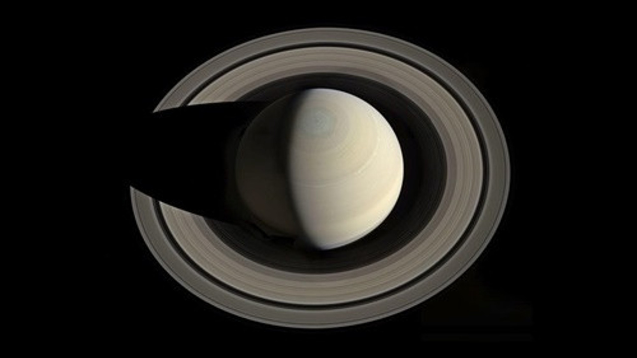 Satürn'ün üstten görünüşü. Etrafındaki yüzük halkaları dikkat çekici. Güneş Sistemi'ndeki en göz alıcı cisim. Gezegenin yüzüklerine düşen gölgesiyle bu fotoğraf paha biçilmez bir görsellik sunuyor.