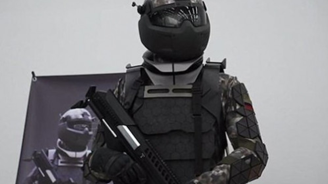 Zırhı giyen askerin görüş alanı olan siyah cam aslında bir ekran görevini de görüyor.