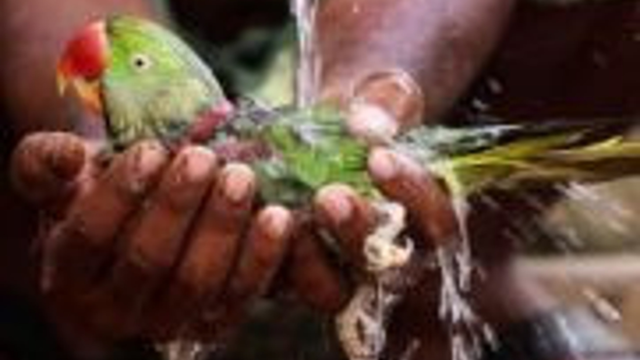 Hindistan Sıcak havaya dayanamayıp ağaç dan düşen papağan bir köylü tarafından ıslatılırken