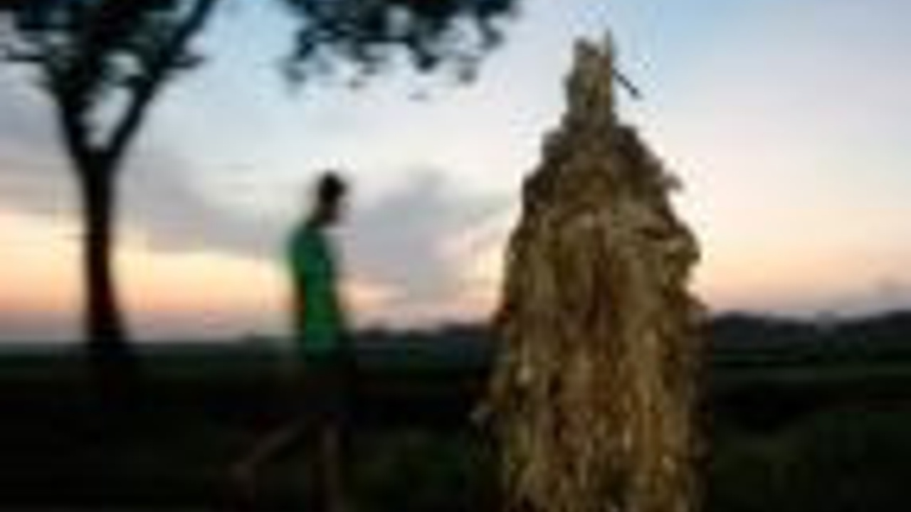 Filipinler Çamura bulanmış ve muz yaprakları ile vücudunu kaplamış bir katolik Baptist bayramı kutlamaları öncesinde