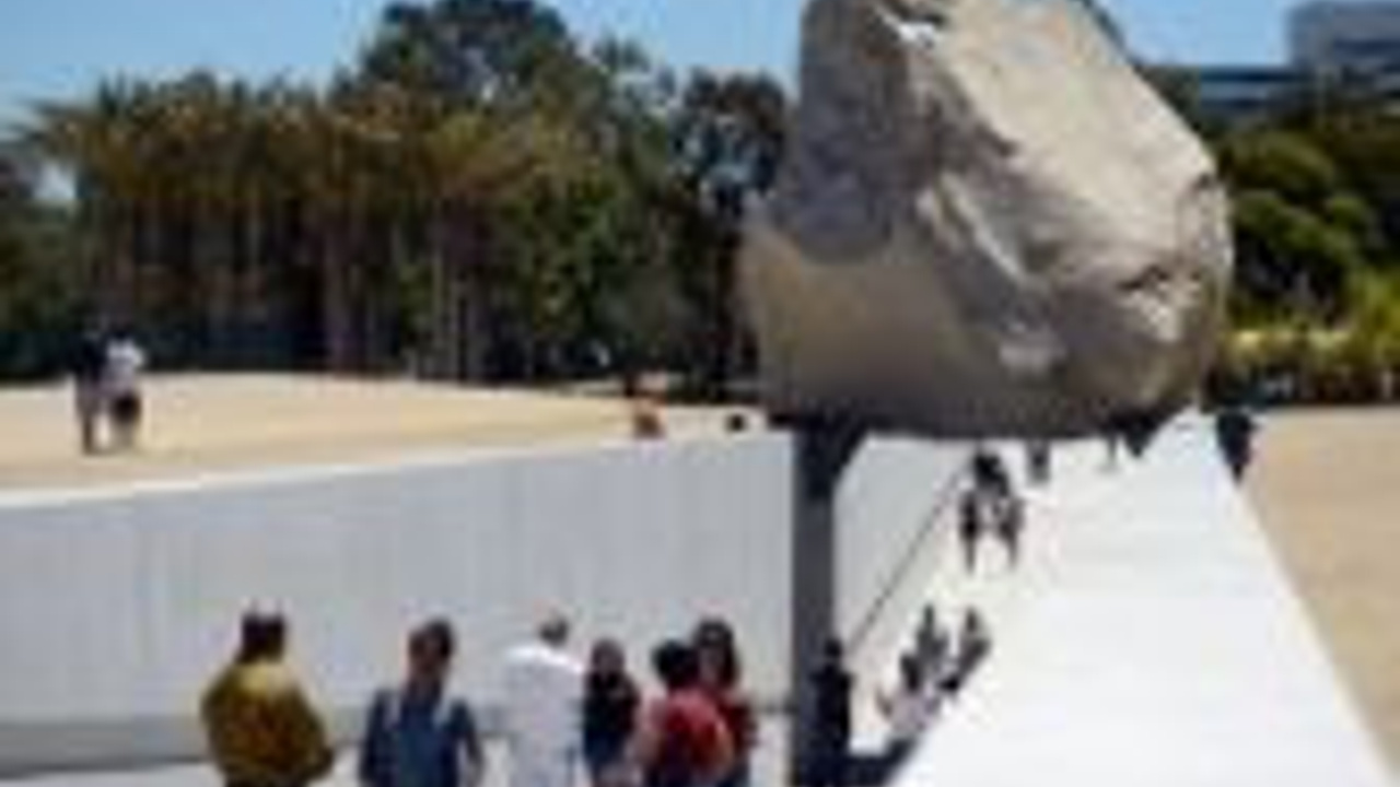 ABD Michael Heizer tarafından sanat eseri haline getirilen 340 tonluk bir kayayı inceleyen ziyaretçiler