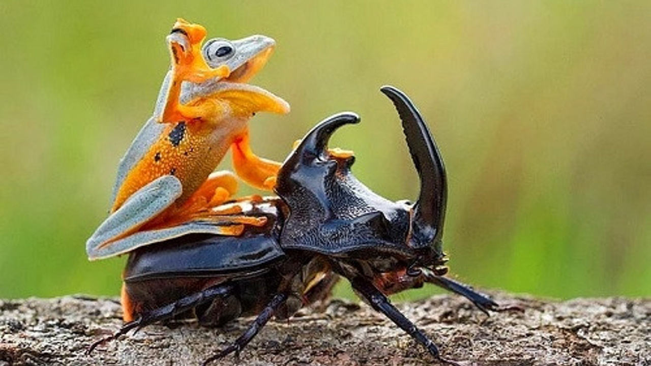 Yetenekli vahşi yaşam fotoğrafçısı Endonezyalı Hendy Mp, dünyanın en garip görüntüsünü yakalamışa benziyor. Bir ağaç kurbağası, bir gergedan böceğinin tepesinde adeta kovboylar gibi rodeo yapıyor.