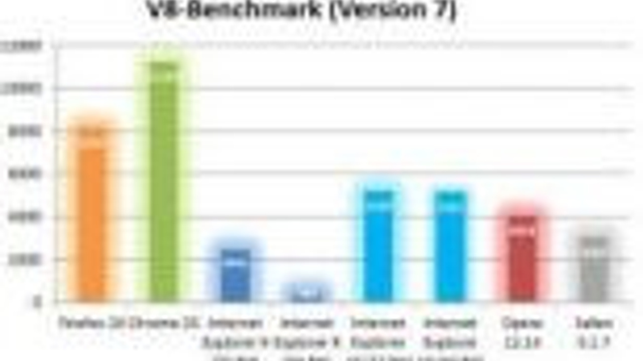 V8: Internet Explorer 9 (32-bit) SunSpider'da hiç de fena olmayan bir sonuç elde eden Internet Explorer 9 (32 bit), V8 testinde fark edilir derecede zayıf kalıyor: sadece 1.613 puan alan Explorer 9 (32 bit), Chrome, Firefox ve Opera'nın gerisinde kalıyor.