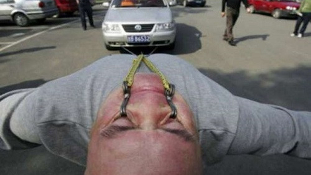 Sırt derisine takılan 2 çengel ile Hannibal Helmurto, 24 Ekim 2004'te Londra Croydon'da 4 tonluk bir kamyoneti 91.4 metre çekti