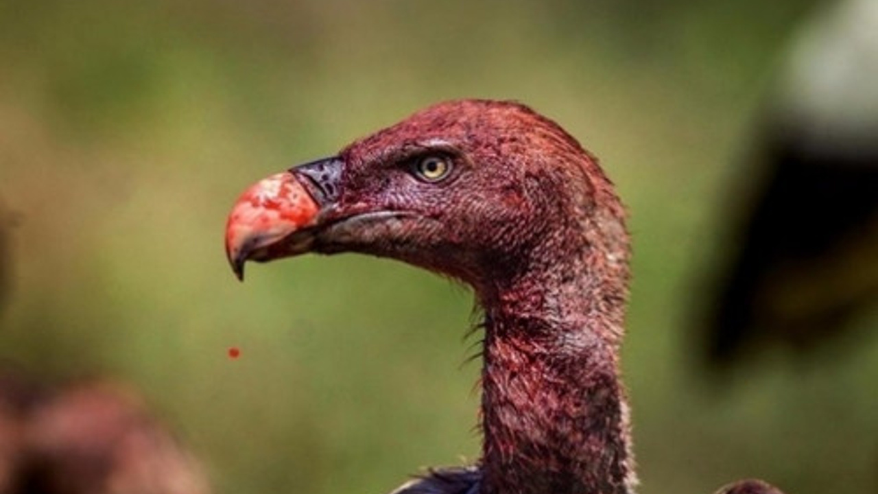 Boynunda ve kafasında seyrek tüyleri olmasıyla tanınan Rüppel akbabasından damlayan kan, dehşet verici... CHARLIE HAMILTON JAMES