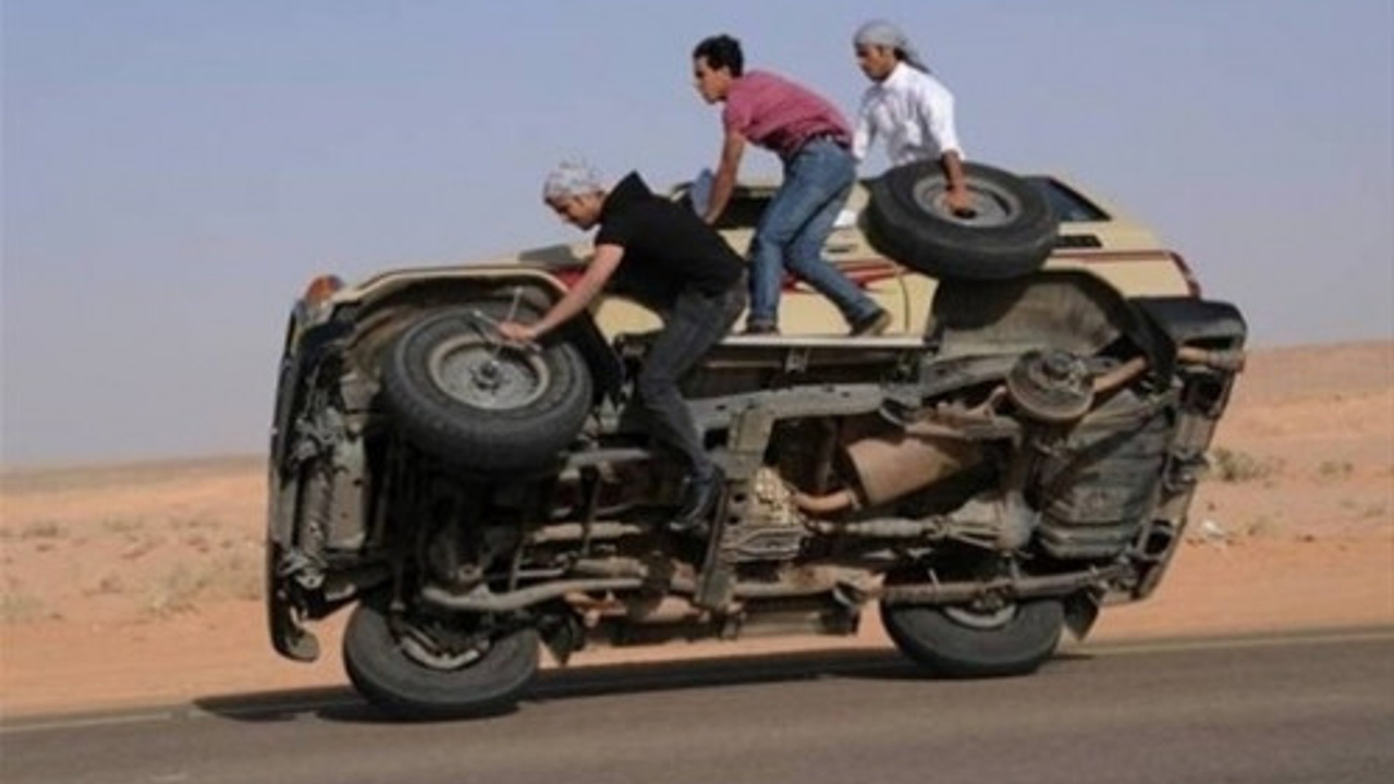 Zengin Arap gençleri lüks arabalarıyla çöl yollarında akrobasi gösterisi yapmayı çok seviyor.