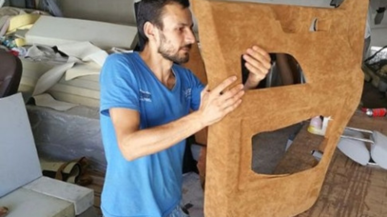 Aracın içindeki her şey sökülüp özel tasarım yapılarak deri ve süet kullanılarak kaplanıyor.